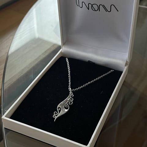 Lumoava Eden riipus ketjulla. Riipuksen koko 12 × 30 mm. Pallon halkaisija 6 mm. Materiaaleina hopea ja vuorikide. Säädettävän ketjun pituus 42/45 cm. Myyntihinta kaupasta ostettuna 80 €. Kulkeutuu myös Turun keskustaan. Mahdolliset postituskulut lisätään hintaan.