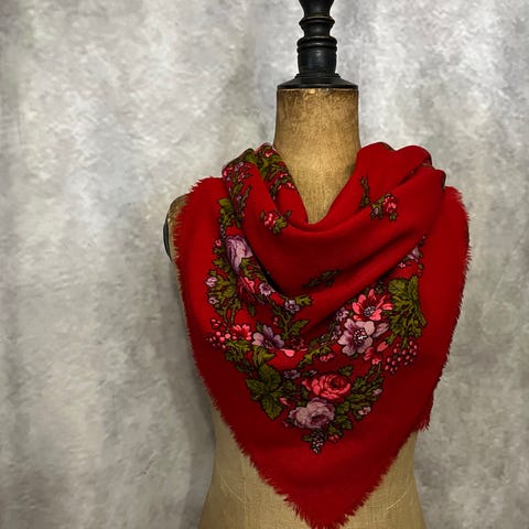 kuvan mukainen huivi, Eipä juuri käytetty koko hapsuineen noin 120x120 cm eli toista metriä kanttiinsa. lanka on aika ohutta , enkä ole varma onko villaa. vai keinoa, värit ovat kauniit.