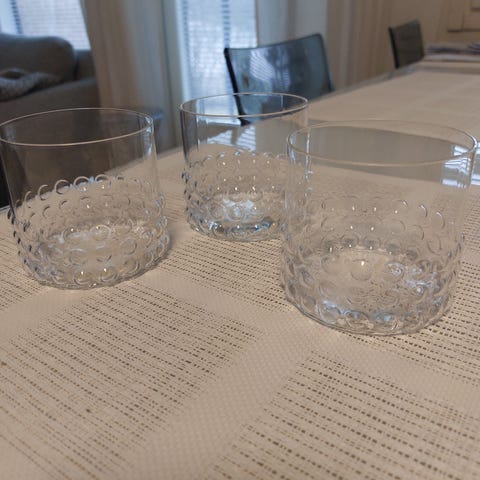 Myydään 6 Grappo-liköörilasia. Lasien korkeus on n. 12,5 cm. Lasit virheettömät, viidessä on Riihimäen lasin tarra tallella. Kuvassa lasit pesemättömät.