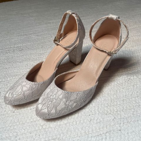 Chantanan luonnonvalkoiset ja pitsikuvioiset hääkengät. Korko 5 cm. Koko 37, mutta sopii paremmin 38 kokoiselle jalalle. Mukavan tuntuiset ja pysyy remmin ansiosta hyvin jalassa. Ollut yhden päivän käytössä. Toisessa kantapäässä hieman kulumaa, muuten lähes uuden veroiset. Kulkeutuu tarvittaessa myös Turun keskustaan. Mahdolliset postikulut ostajalle.