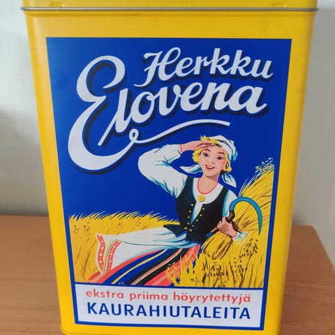 Myydään hyväkuntoinen Elovena peltipurkki. Sisältä täysin kirkas.