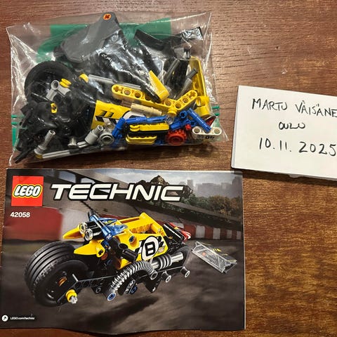Moottoripyörä ja ohjekirja seuraavalle leikkijälle. Pyörästä puuttuu muutama huomaamaton osa.