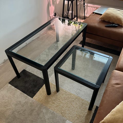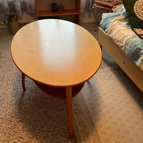 Annetaan tukeva ja painava iso pöytä, käytetty sohvapöytänä. Pöydässä kannen alla neljä lokerikkoa lehdille yms.