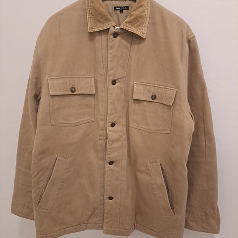 Painonapein suljettava, reilu paitamallinen H&M-toppatakki. Muutaman kerran käytetty, joten laatu on erinomainen. Tahroja eikä muutakaan negatiivista ole. Pinta pehmeää puuvillaa, vuori ja vanu polyesteriä. Isot etutaskut. Rinnanleveys 66cm, hartialeveys 54cm, takapituus 79cm.