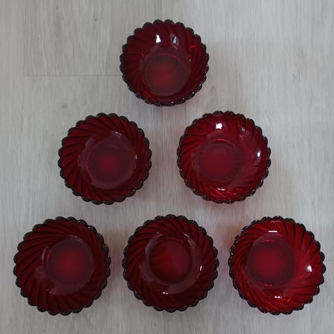Vanha Riihimäen Lasin punainen Baccara-kulho. Halkaisija 18 cm, korkeus 5,5 cm. Ehjä ja siisti, hieman käytössä kulunut. Postitus tai nouto.