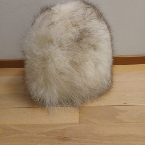 Musta tikkivuori. Sisäpuolella tikkiset korvaläpät. Sisämitta (pään ympärys noin 56 cm).