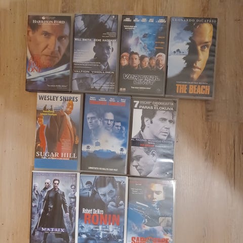 11 kpl VHS kasetteja odottavat katsojaa joka haluaa katsoa vanhoja leffoja VHS videonauhurilla