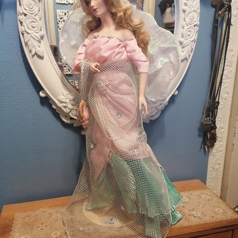 Kaunis, virheetön posliininukke. Ollut koristeena vitriinissä, ei leikeissa. Vaalean punainen puku jossa helmikoristeita ja pitsiä. Tumman ruskeat pitkät rullakiharat kengät, hattu ja seisontateline.
