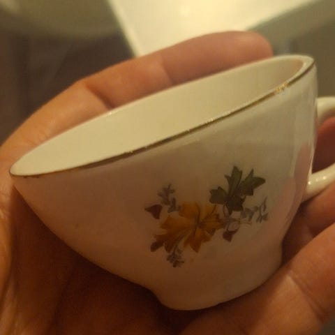 Ihanat hempeän väriset kupit, tassit ja pullalautaset x 5, käsin tehty kultakuviointi