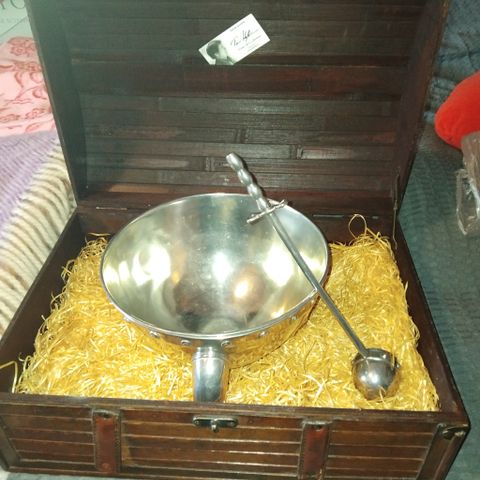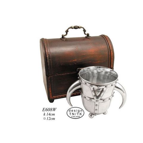 Mahtava viikinkiaiheinen sarvituoppi puulaatikossa. Tuoppi pysyy pystyssä kolmen tinapallon varassa. Tuopista saa tukevan otteen puristamalla jämäkistä sarvista. Tuote on suomalaista designia