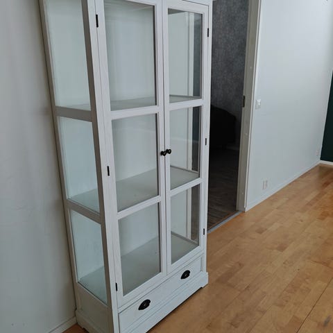 Seinään kiinnitettävä teak-vitriini, leveys 130 cm ja korkeus 41 cm, syvyys 28 cm. Keskellä väliseinä, yksi lasihylly molemmilla puolilla. Reunahiotut lasihyllyt unohtuivat laittaa kuvauksessa paikoilleen, tulevat tietenkin mukaan.