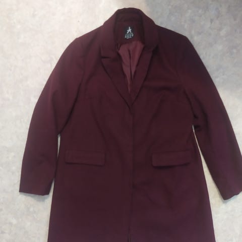 Myynnissä Atmosphere -merkkinen tummanpunainen villakangastakki, koko 12 (38). Takin pituus noin 79cm. Materiaali: 60% villaa, 30% viskoosia, 10% polyesteria.