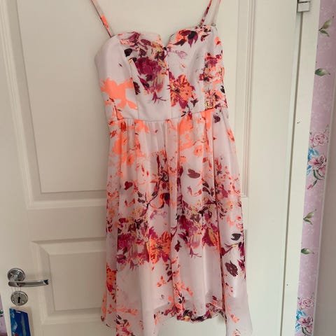 Kuvan Vero Moda:n ruskea juhlamekko kukkakuvioilla, olkaimeton, koko 36-38. Mekon pituus noin 80cm.