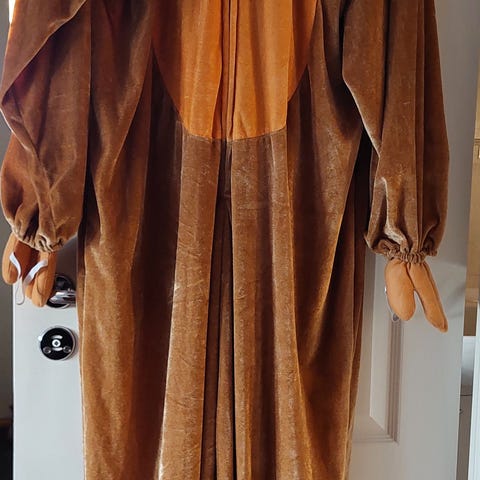 Myydään hyväkuntoinen penkkaripuku/naamiaisasu. Koko pieni M. Vastaa ehkä pikemminkin S-kokoa. Pituus olka-nilkka 130 cm ja kainalo-nilkka 114 cm. Kainalo-kainalo mitta 58 cm. Takana oleva vetoketju helpottaa vessassa asiointia puku päällä. (3. kuva)