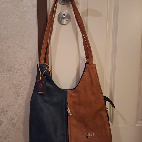Uusi laukku käsi- ja olkahihnalla, nepparikiinnitys ja sisällä keskellä iso vetoketjullinen tasku. Korkeus 35 cm, leveys 34 cm, pohjan leveys 11 cm. Sijainti Ylöjärvi, postitus ok, kulut ostajalle.