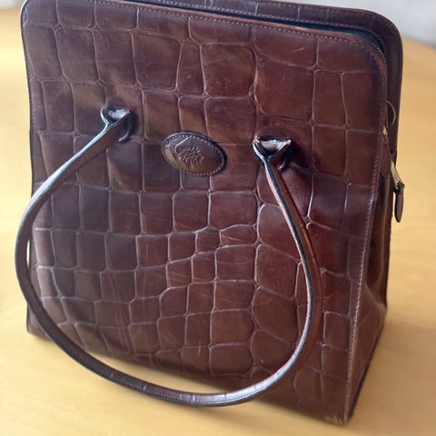 For sale here is an authentic, beautiful, and rare vintage Mulberry Somerset North South tote, crafted from calfskin leather. It’s in used but good condition. This versatile bag can be worn on the shoulder (though not with a thick jacket), on the crook of the arm, or crossbody like a messenger bag. It’s spacious enough to fit a standard-sized laptop. Practical and versatile, this bag is both classy and casual.