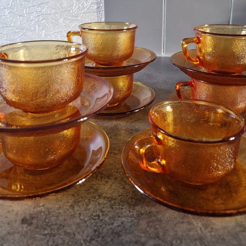 Kauniit amber ruskeat lasiset 1970-luvulta tee/kahvi kupit&lautaset 6kpl + 2 kuppia.