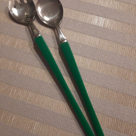 Hyväkuntoiset vanhat salaattiottimet oranssilla varsilla.