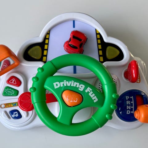 Hyväkuntoinen värikäs pöytään tai tuoliin kiinnitettävä ratti, jossa kääntyvät avaimet, ratti ja vipu. Pyöriviä palleroita edessä. Kiva lelu.