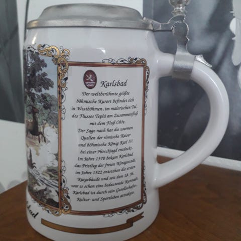 Kellollinen olut tuoppi 5dl, kultareunus, korkeus 13,5cm, halkasija 8,5cm, kello toimii. 15e