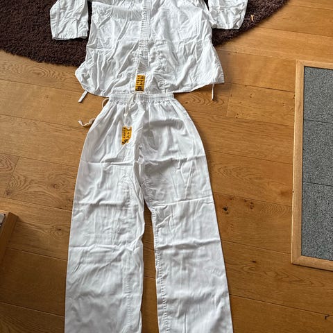 Hoi jeon moo sool -puku (takki ja housut). Koko pienehkö 170cm. Takissa edessä pyöreä merkki ja takana kuvan mukainen teksti. Takki on hyväkuntoinen. Housut kokonaan valkoiset ja kuluneemmat kuin takki. Koiratalous. Lähetys Matkahuollon kautta tai nouto Herttoniemestä.