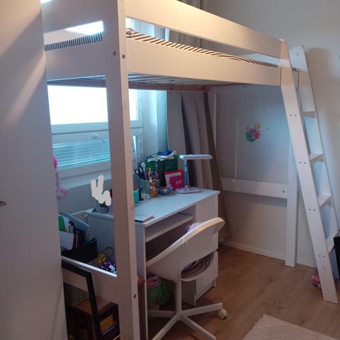Myydään itserakennettu parvisänky jossa pöytä alapuolella. Myydään purettuna.