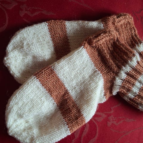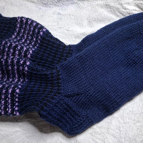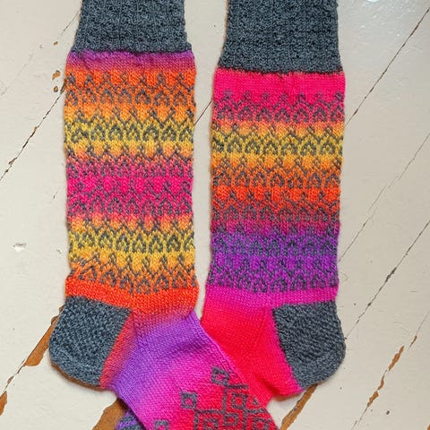Seiskaveikan langoista tehdyt villasukat. Pitkät, polveen asti varsi 45 cm. Pohja 28 cm. Väreinä vanha roosa ja tummaharmaa jossa kimalletta mukana.
