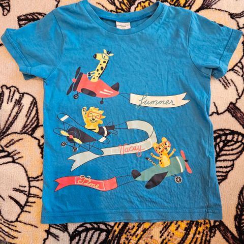 T-paidassa tahroja, jotka eivät ole lähtenyt pesussa. Tahrat näkyvät kuvassa. Paidassa pieni reikä.