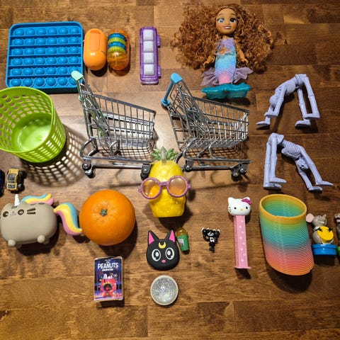 2 hevosta, 2 karkkitornia, minimaapallo, 2 nukkea, koristehattu, kravatti verkkokuviolla, koristepallo, hymynaama, koiranpää laukku, karvanopat, 3 metallista säilytysastiaa, muovinen naamarasia.