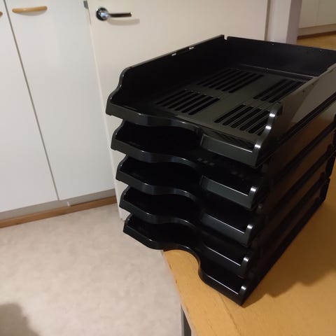 Irrallisia päällekkäin pinottavia A4-asiapaperilokerikkoja.