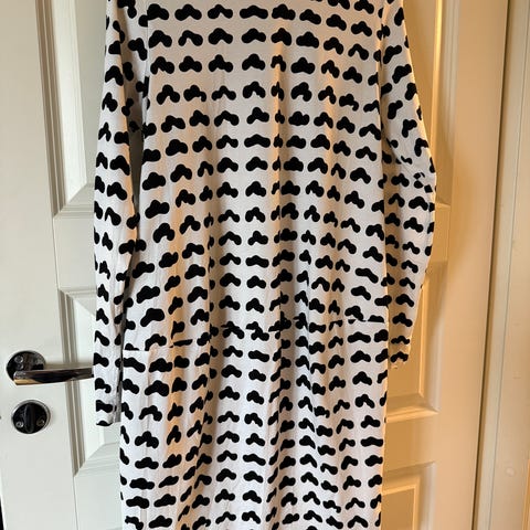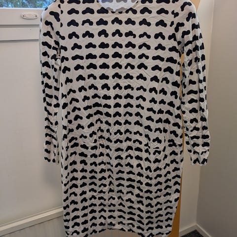 Mustavalkoinen Pussukka Hattara -mekko. Kauniilla hattara kuosilla. Materiaali 100% puuvillaa. Pieni tahra, joka näkyy viimeisessä kuvasssa. Lähtee todennäköisesti pois tehokkaalla tahranpoistoaineella. En ole itse yrittänyt poistaa. Postitus mahdollinen.