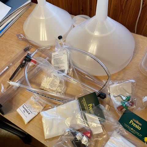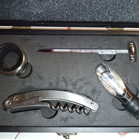 Viinikäymisastia, vesilukko, korkituslaitteet, (1kpl kruunukorkille 26mm ja 1 kpl viinipullon korkille), 2kpl ominaispainomittari.