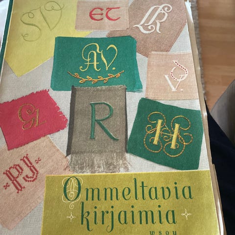 Aino ja Juhani Hausmann Ommeltavia kirjaimia,tässä kirjassa on mahdollisemman monipuolinen kokoelma erilaisiin kankaisiin soveltavia ommeltavia kirjaimia 5 + postitus 5