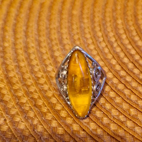 Keino meripihkaa oleva sormus, ei siis aitoa meripihkaa. Kaunis ja naisellinen. Postitus ok.