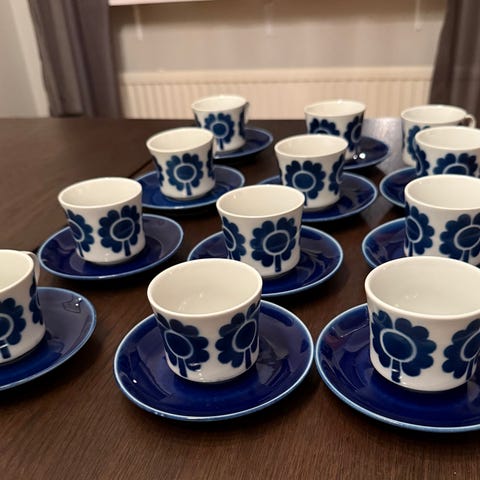 2 kahvikuppia, 6 sinistä alulautasta, 4 asettia, sokerikko, kermakko ja tarjoilulautanen.