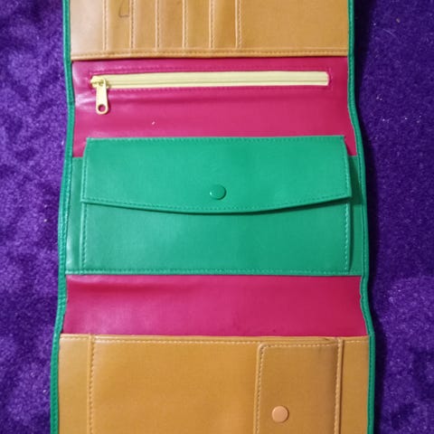 Musta iltalaukku/iso lompakko, 11 x 19,5cm, 'krokotiilin- nahkajäljitelmää' 70-luvulta, sivulokerot ja vetoketjullinen lokero, pitkä ohut hihna irtoaa metallikoukuista ja mahtuu 'lompakon' sisään, neppari toimii, miltei käyttämätön,siisti, 4eur