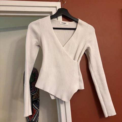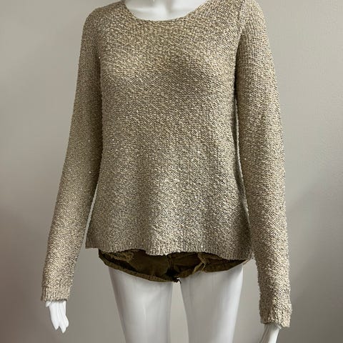 Valkoinen pehmeä neulepaita, jossa on edessä koristeena paljetteja ja timantteja. Koko S. Neuleen pinnassa on pientä nukkaantumista, muutoin erittäin hyvässä kunnossa.