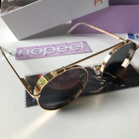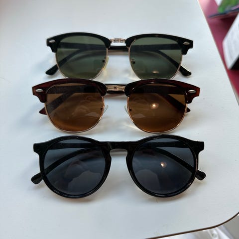 Uudet aurinkolasit, miesten malli. Suojatarrat paikoillaan. Ruskeat linssit ja kultaiset kehykset.