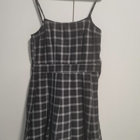 Musta pohja, valkoiset pilkut. Hyvin laskeutuvaa 100% viskoosia. Yläosa smokkirypytetty ja hyvin joustava. Säädettävät ohuet olkaimet.
