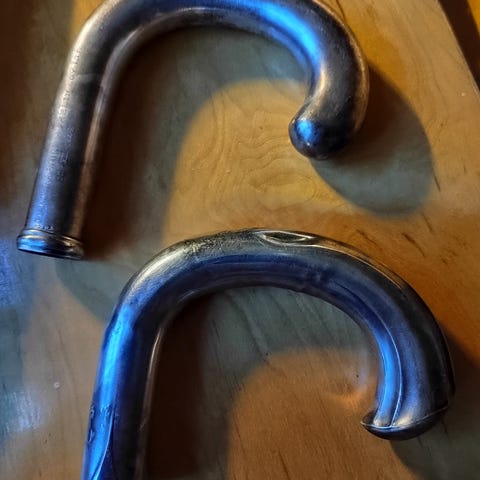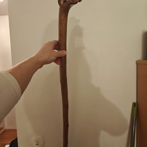Käsikahvana pieni kirvespää, mesingkisuojus, alapäässä metallipiikki