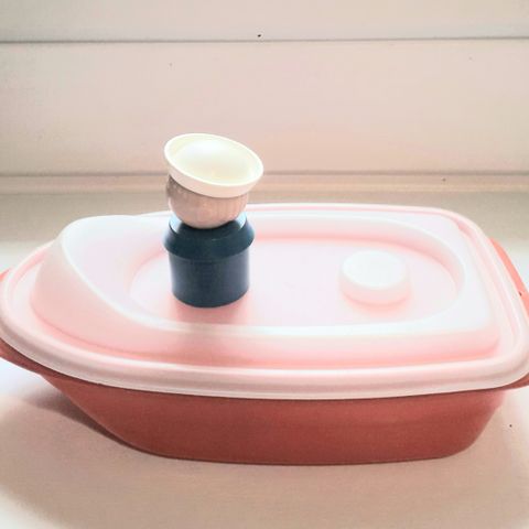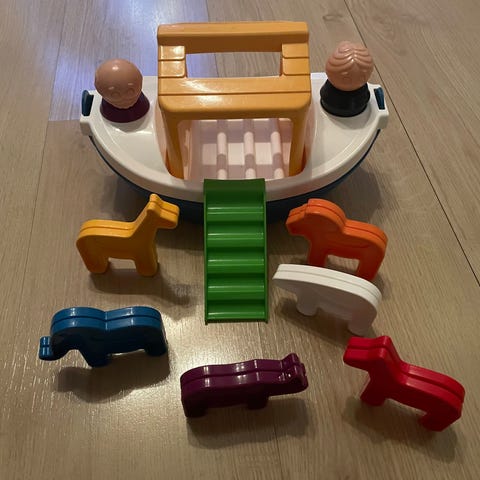 Käyttämätön Nooan arkki kaikkine osineen.Eläimiä aina pari, ovat samalla piparkakkumuotteja. Helpot pestä ja pitää puhtaana. Ovat olleet usean vuoden kaapissa,että oiskohan jo vintagea. Tupper Ware tuote. Laivan pituus 26 cm.