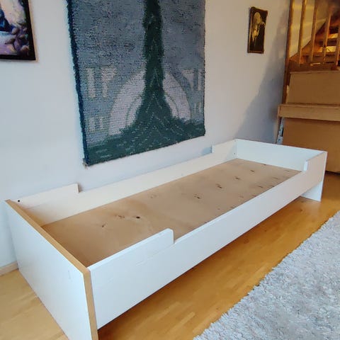 Muurame Jolla-sänky. Käytön jälkiä näkyy ja muutama tarra kyljessä (jotka saa poistettua), mutta palvelee vielä hyvin uutta nukkujaa.