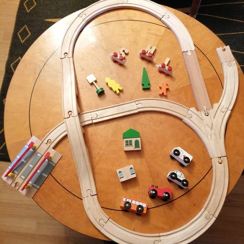 Junarata on 60-, 70-luvuta. Settiin kuuluu veturi, sirkusaiheinen matkustajavaunu, sekä vaunu jossa kirahvi. Rata on punainen ja koottuna se on iso ympyrä. Juna vaunuineen ja ratoineen on erinomaisessa kunnossa. Veturi toimii kahdella patterilla. En ole testannut toimiiko veturi. Styroksinen laatikko löytyy, mutta ei kantta.