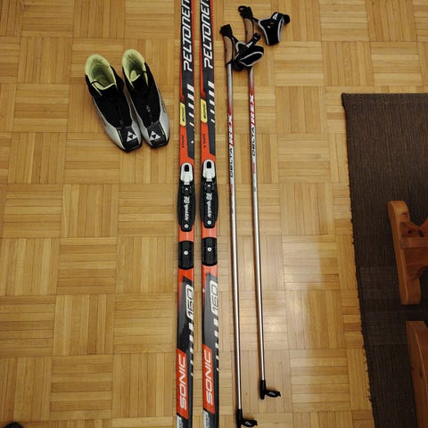 Perinteisen hiihtosetti, sukset 203cm, sauvat 160cm ja monot 44