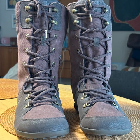 Lämmin talvisaapas joka sopii vaikka paljasjalkakenkäilijälle nolladropin ja taipuisan pohjan ansiosta. Varvastila pyöreähkö eli ei ideaalein mutta myötäilee kivasti omaa jalanmuotoa rakenteesta ansiosta. Ihana lämmin kunnon villavuori. Wrap on malli, eli tarroilla suljet kengän jalkapöydän ja pohkeen ympärille omiin mittoihin sopivaksi. Korkea varsi. Itsellä 38cm pohje, ei sovi sitä paksummille.