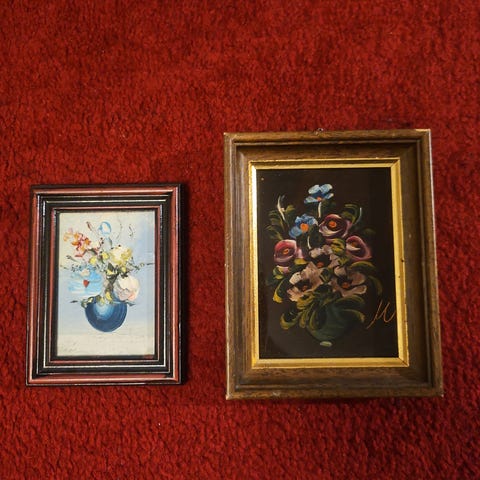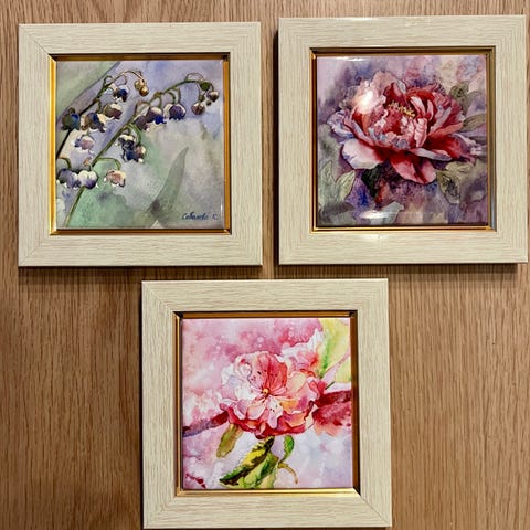 Myynnissä kolme pakettia pahvisia kuvia kukista kehyksiin laitettavaksi.