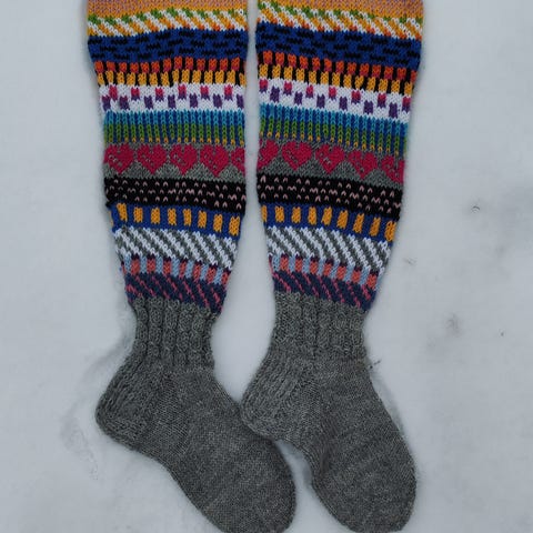 Sukkien terän pituus 26 cm ja varren pituus varren yläreunasta kantapään alle 42 cm. Lankana käytetty Novitan Seitsemän Veljestä, pesu 40 astetta. Ei sisällä postikuluja.