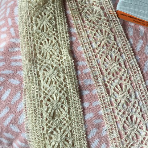 Viisi erilaista puuvillapitsin pätkää. Kuva 2, leveys 14 mm pituus 110 cm. Kuva 3, leveys 2-3 cm pituus 1 m. Kuva 4, leveys 4 cm pituus 80cm. Kuva 5, leveys 2 cm pituus 95 cm. Kuva 6, leveys 2 cm pituus 110 cm. Nouto Tesomalta sovitusti tai postitus kirjeessä myös ToriDiili käy.