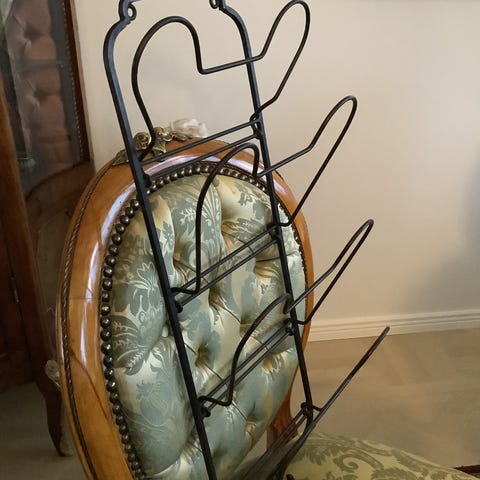 Metallinen musta teline kuville ja aikakauslehdille. Teline on tukevasti seisova, mutta kevyt ja siro. Telineen lev on 24 cm, korkeus 140cm ja syvyys 30cm. Viistoja "hyllyjä" on yhteensä 5 kpl kahteen suuntaan.
