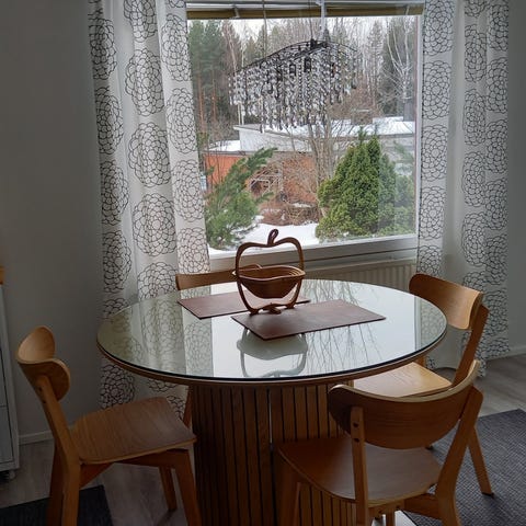 Varastopoistona ruokaryhmä, lasikannella Polari-pöytä ja Mira-polyrottinki tuolit !